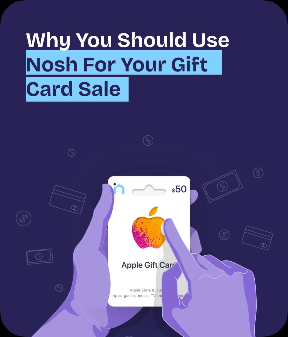 On Nosh, you can Sell Steam Gift Card, Sell Google Play Gift Card, Sell Amazon Gift Card, Sell Amex Gift Card, Sell Razer Gold Gift Card, Sell Apple Gift Card, Sell eBay Gift Card, Sell Sephora Gift Card and 100+ other gift cards.