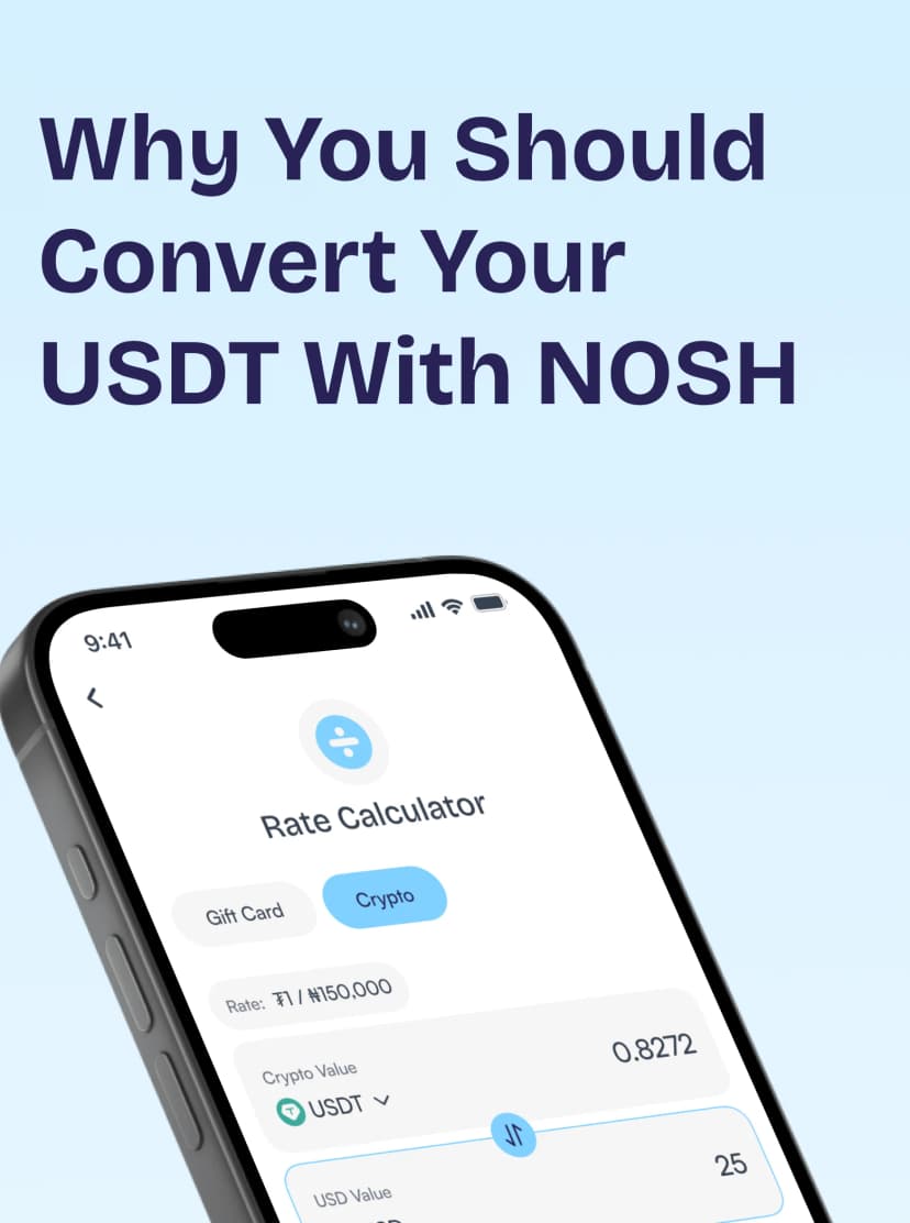 Nosh allows you to convert your BTC, LTC, DOGE, USDT (Tether), Tron (TRX), ETH, BNB, and USDC to Naira or Cedis.