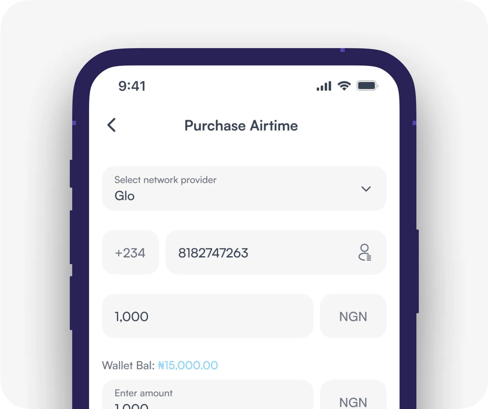 Under Refill, choose Airtime on the dashboard page, specify the network, amount and your phone number, then complete your purchase.