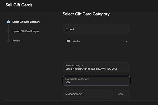 Input the amount on your Vanilla gift card. Nosh will instantly show you the equivalent amount in Naira based on current rates.