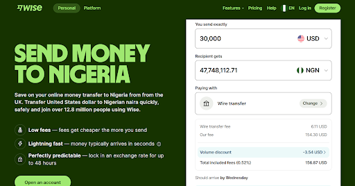 Wise is one of the cheapest and safest ways to send money to Nigeria. This transfer service uses the mid-market exchange rate -the same one you’d find on Google, meaning you get more value for your money. Transfers to Nigeria are typically completed on the same working day, making it a top choice if you’re seeking cheap ways to send money to Nigeria.