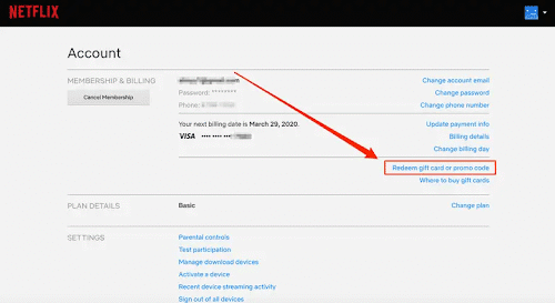 4. Locate the option that says âRedeem gift card or Promo codeâ and click it. Youâll most likely see it under the âMembership & Billingâ section.
