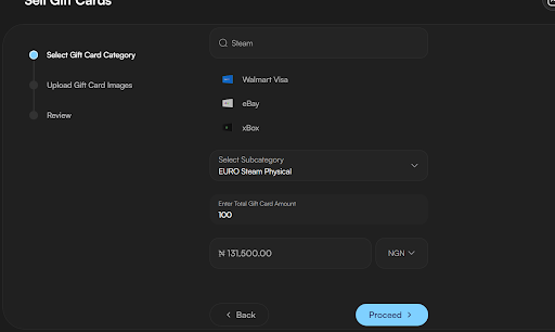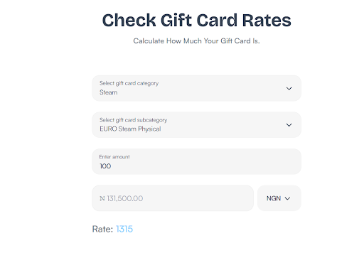 Next, enter the exact value of your Euro Steam gift card. The amount you will receive in Naira will be displayed instantly.