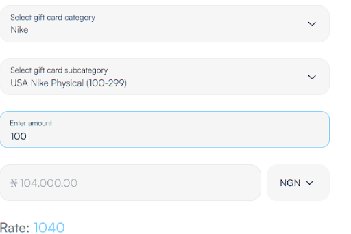 In summary, a $100 Nike gift card can earn you up to N104,000 for physical cards or N80,000 for e-gift cards. You can easily calculate the value of your Nike gift card before selling it using Noshâs rate calculator. Trading your Nike gift card on secure platforms like Nosh ensures fast transactions, safety, and the best rates.
