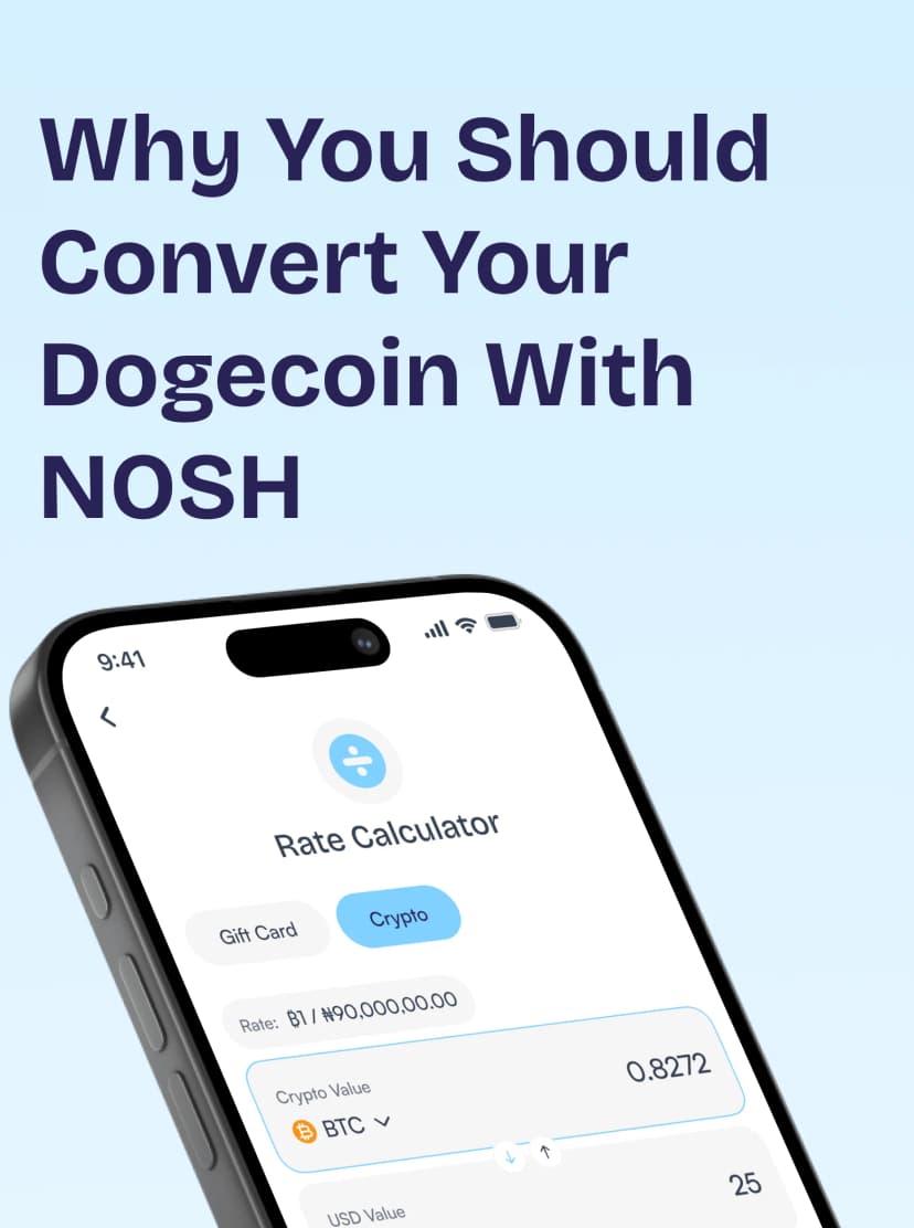 Nosh allows you to convert your BTC, LTC, DOGE, USDT (Tether), Tron (TRX), ETH, BNB, and USDC to Naira or Cedis.
