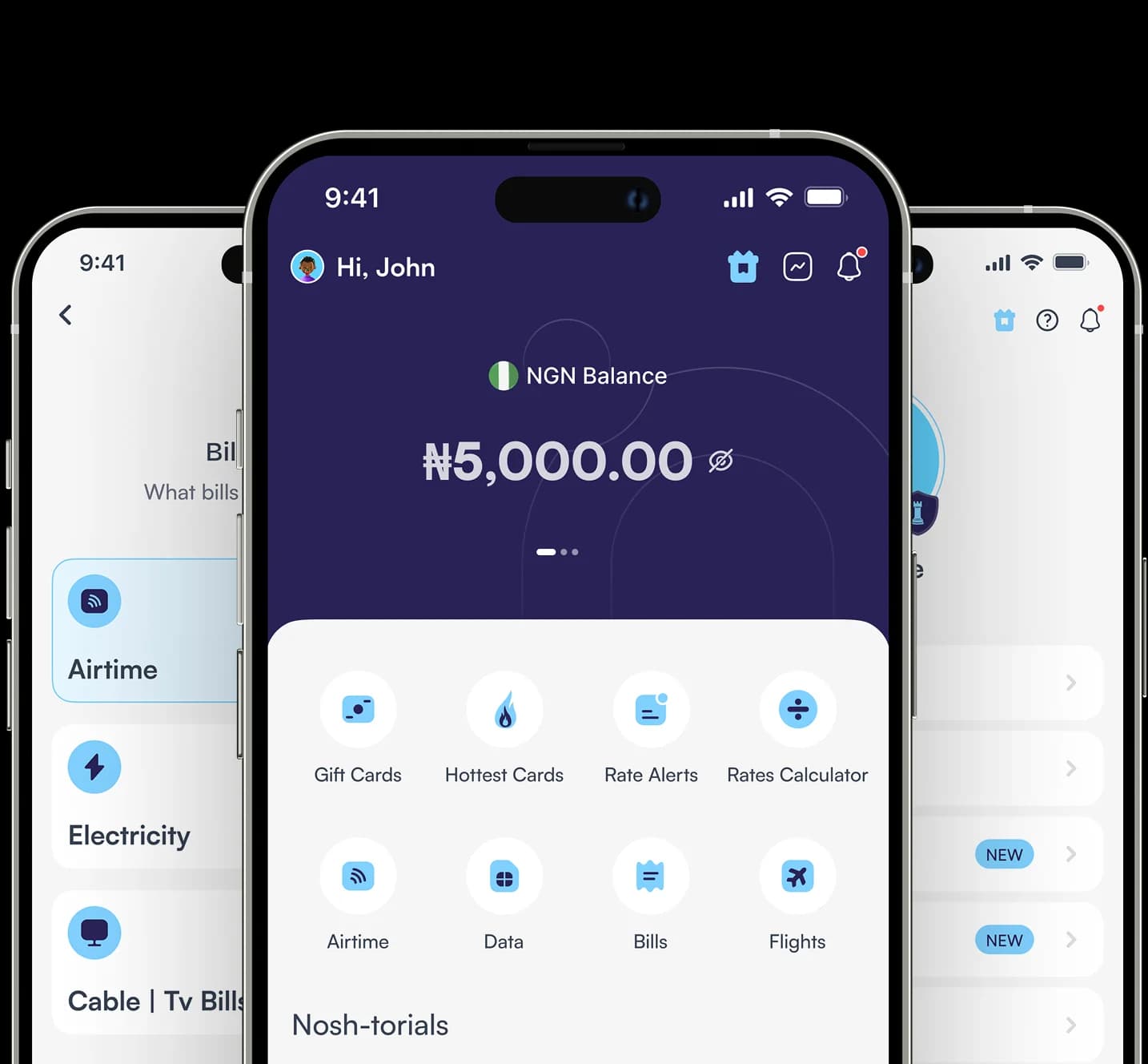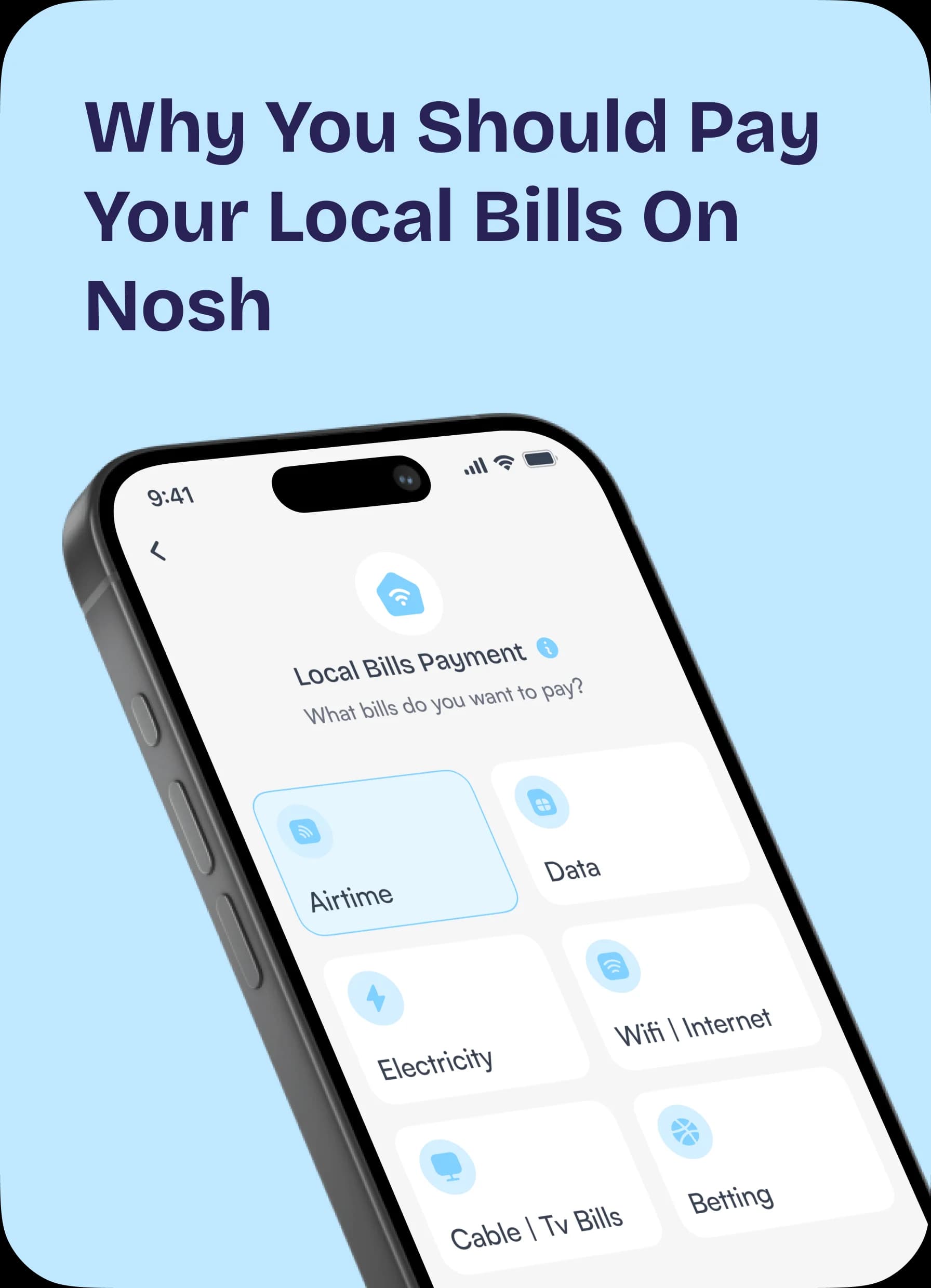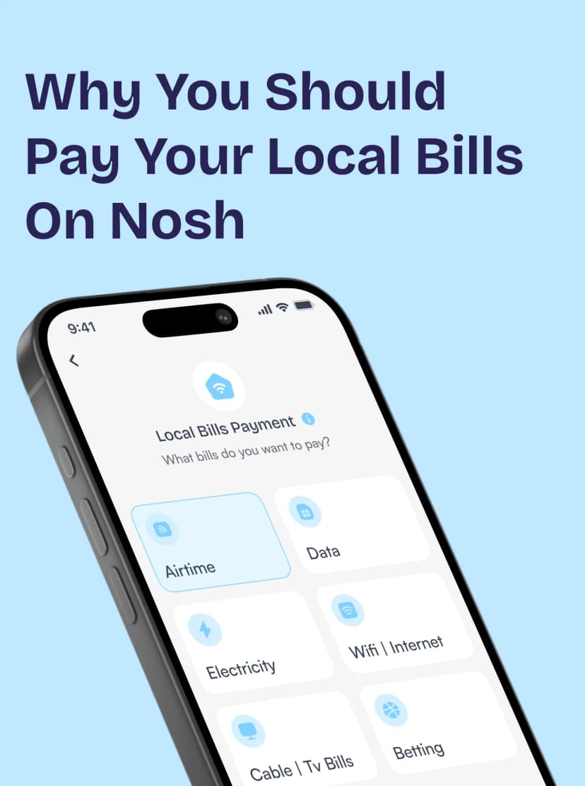 Pay airtime, data, electricity, wi-fi, and TV bills, and fund your bet wallet with your Nosh Naira wallet. Fast, simple and reliable.
