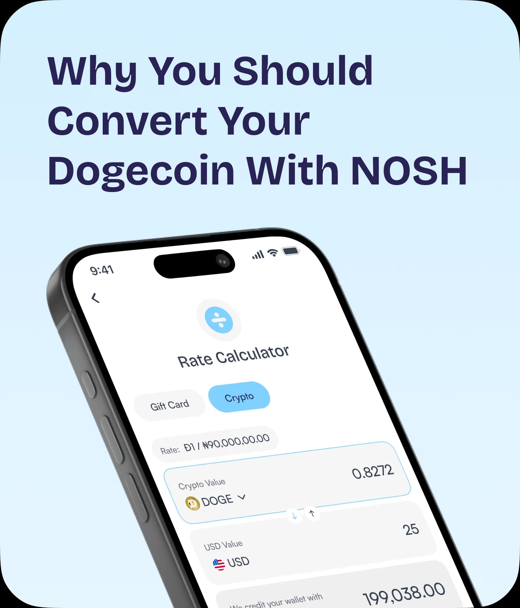 Nosh allows you to convert your BTC, LTC, DOGE, USDT (Tether), Tron (TRX), ETH, BNB, and USDC to Naira or Cedis.