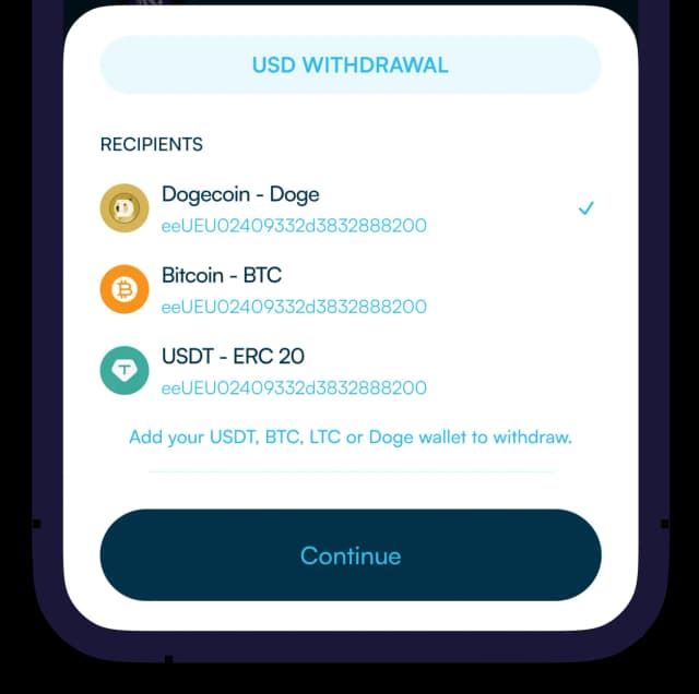Once your USD Wallet is funded, connect your Dogecoin wallet with the address. Withdraw funds, and the amount will be converted to Dogecoin and transferred to your Doge wallet.
